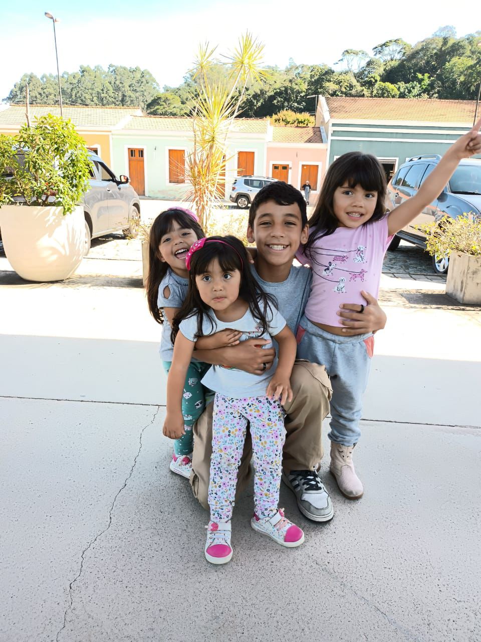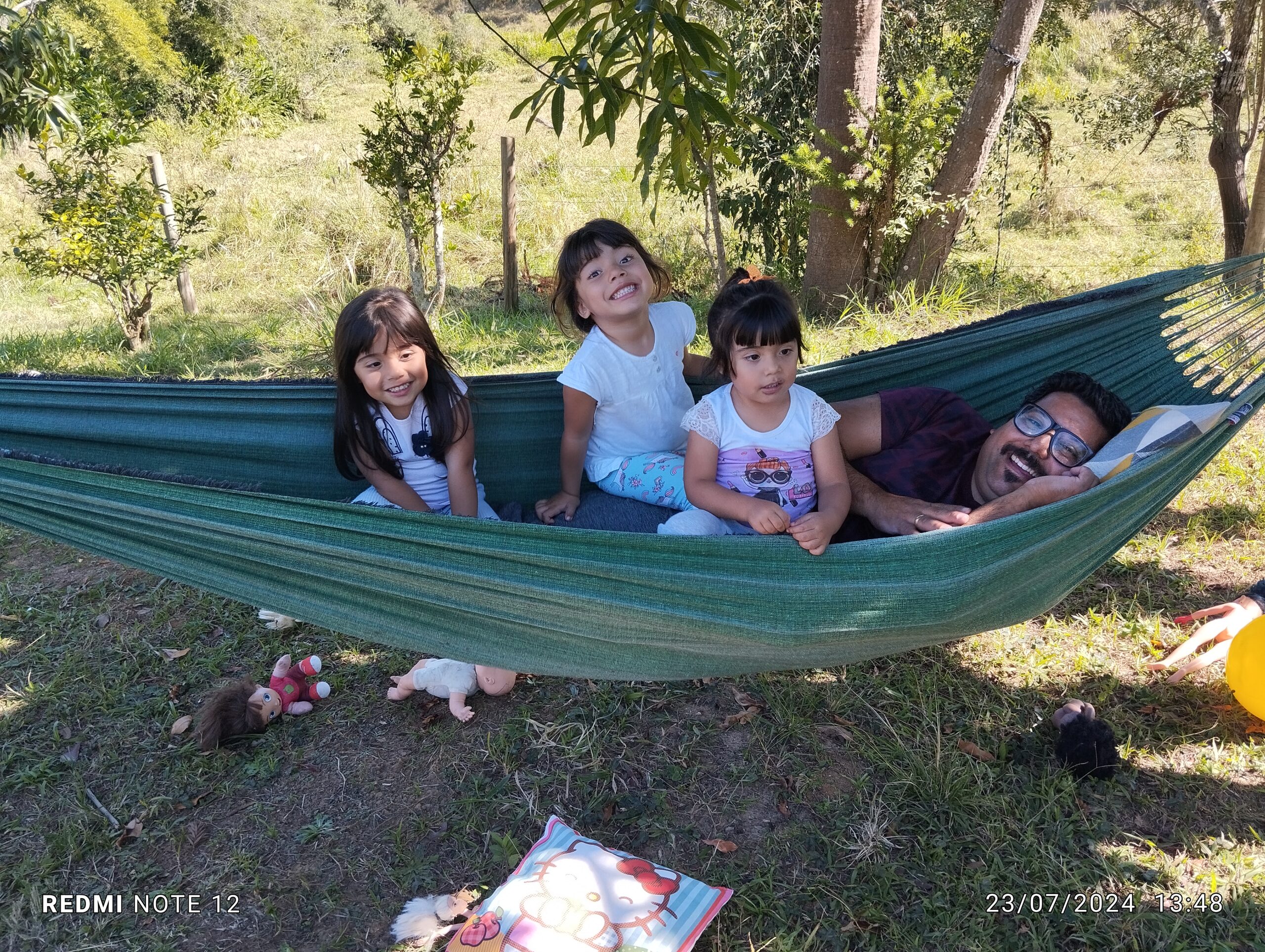 Nós somos Elaine e Alfo, pais orgulhosos de quatro crianças cheias de energia. Até pouco tempo atrás, nossa vida era o cenário familiar de muitos: a correria e o ritmo frenético de uma cidade grande. Amávamos nossa família, mas no fundo, sentíamos um chamado diferente, um desejo por algo mais. Sonhávamos com um horizonte mais verde, com manhãs mais tranquilas e com a chance de oferecer aos nossos filhos (e a nós mesmos!) uma vida com mais simplicidade, mais saúde – para o corpo e para a mente – e mais conexão com o que realmente importa.